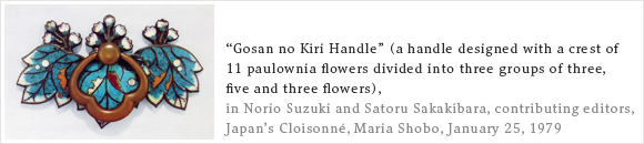 At this point in Japan’s history, cloisonné was used on sword fittings, as well as decoration on kugikakushi (an object that conceals the head of a nail) and sliding door pulls in castles, temples and shrines. However, the cloisonné technique was the closely-guarded secret of the Hirata family and was not shared with the general population.