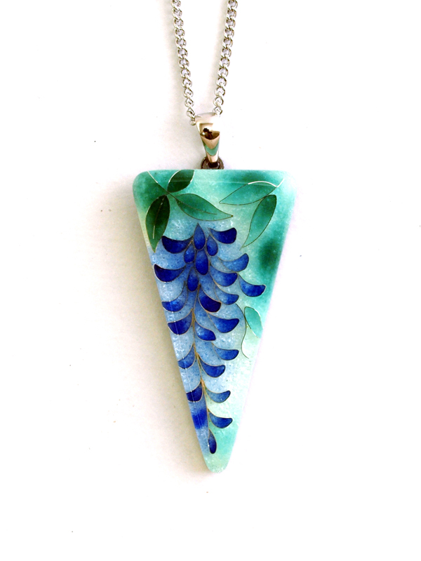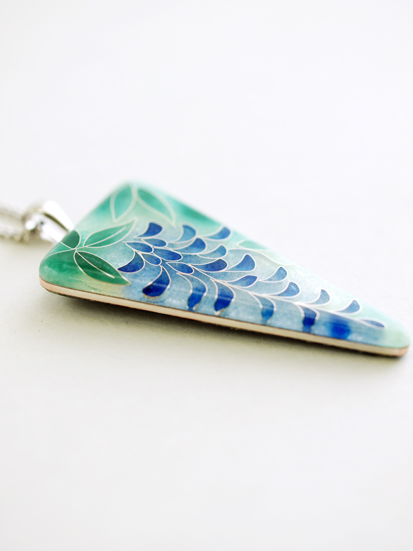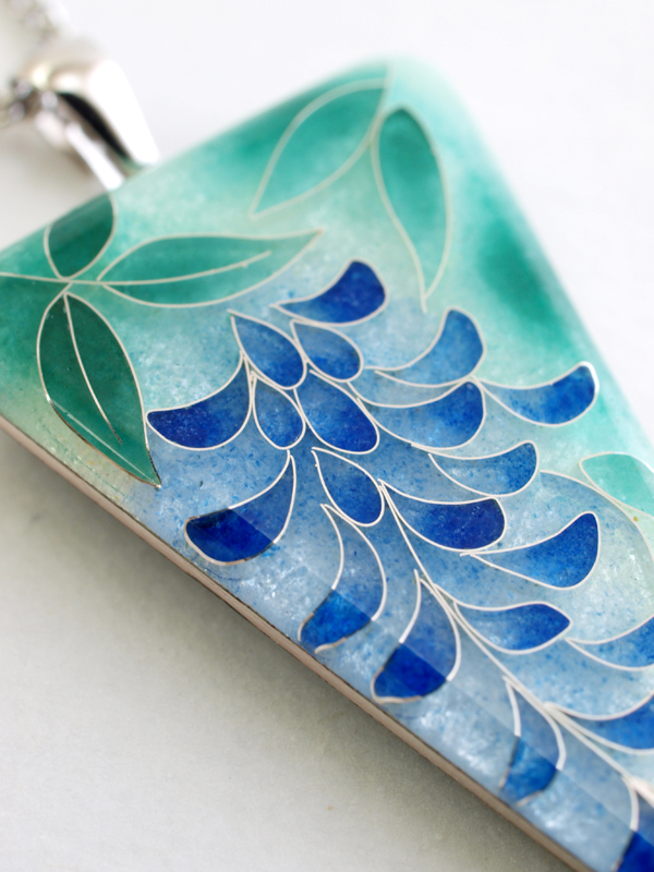 たくさん注文がくると作者も困ってしまうほど、かなり細密な模様が施された「藤」のペンダント。