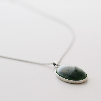 きれいな苔のペンダント。チェーンを付け、紙箱入りでお届けします。七宝部分 H:20mm×W:15mmチェーン 46cm
