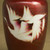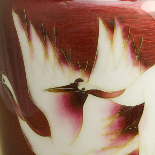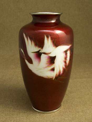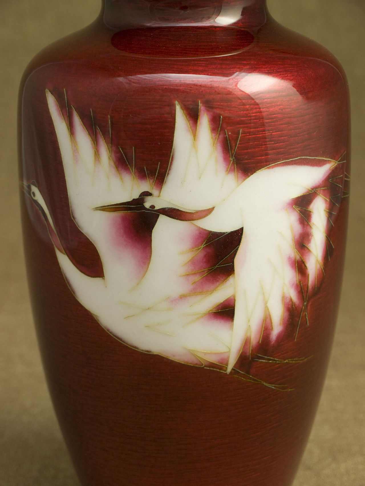 尾張七宝の伝統色「赤透け」の地色に、今にも飛び立っていきそうな躍動感あふれる二羽の鶴をあしらった作品です。