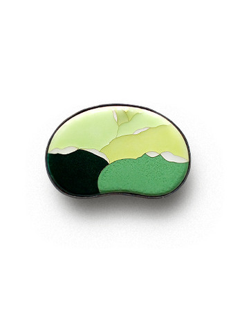 キャベツまるごとの姿を模した、遊び心たっぷりの変わり種。七宝細工らしい透明感をもつ鮮やかな緑色の移り変わりが、シャープに敷かれた銀線によって美しく引き立てられています。