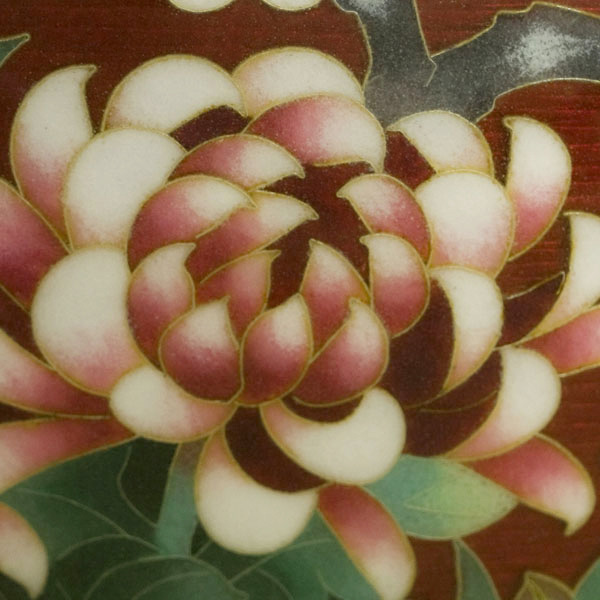 大変優雅な作品で、伝統のモチーフを伝統の赤色透明釉(赤透け)と熟練の彩色技術で作り上げた逸品で、尾張七宝を代表する作品の一つです。