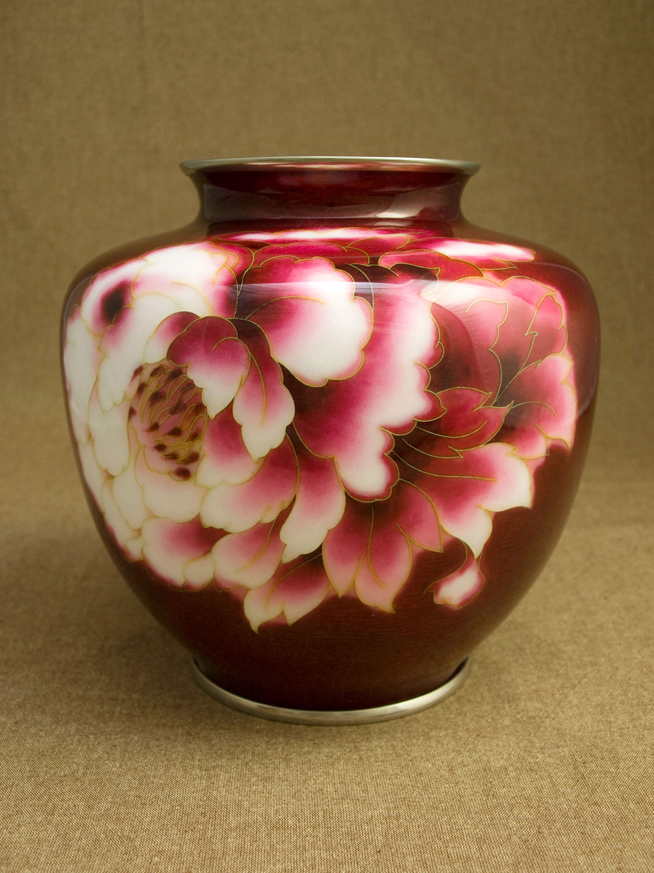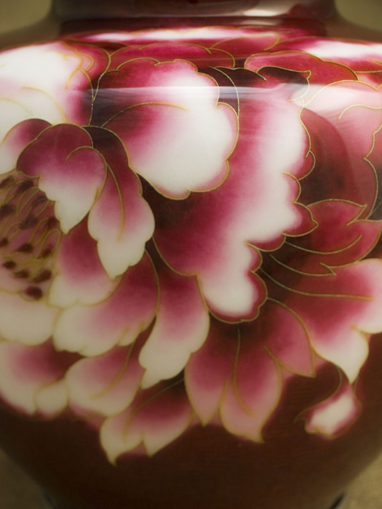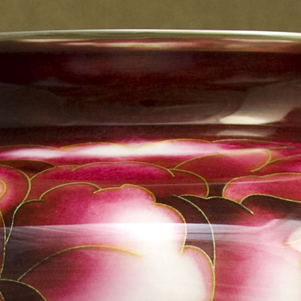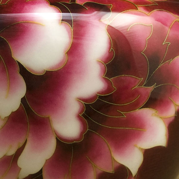 「王者の風格」「高貴」「壮麗」などの花言葉を持つ牡丹の大輪を前面いっぱいに配し、原料の一つに純金を使用し、別名「金赤」と呼ばれる赤色透明釉(赤透け)の深い輝きが、豪華絢爛に彩っています。