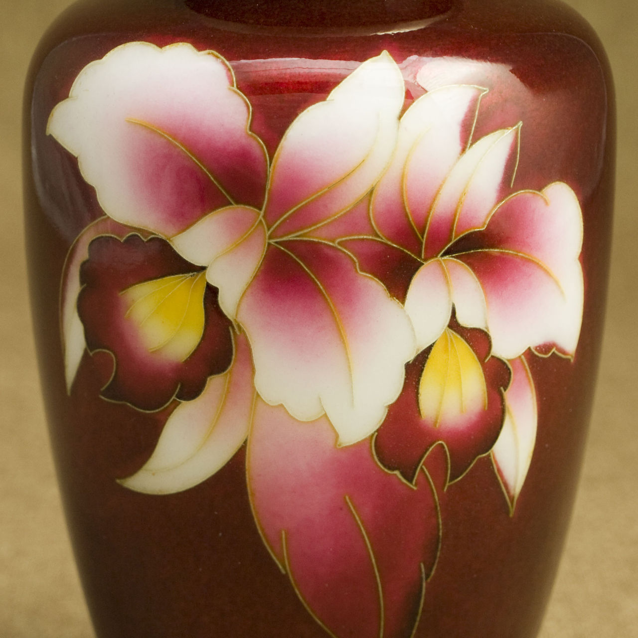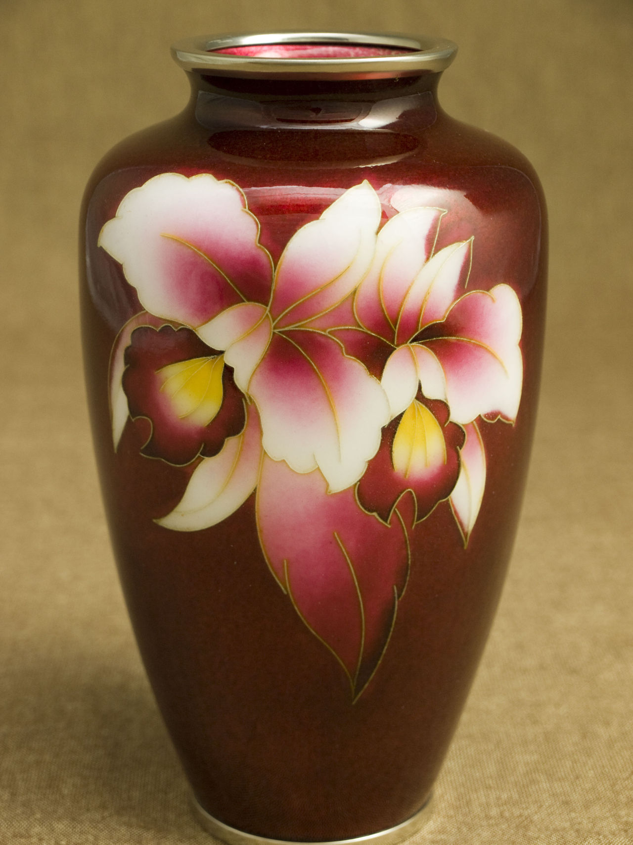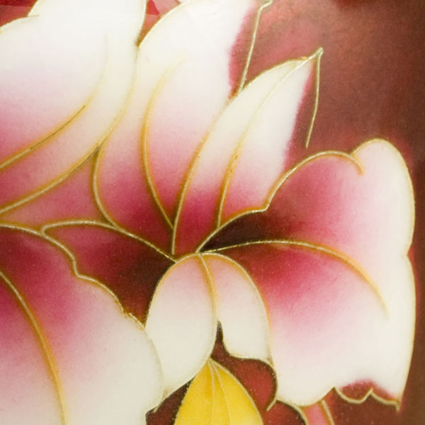 尾張七宝の伝統色である「赤透け」をバックに、花びら香るような華麗さ、しなやかさが表現されています。