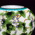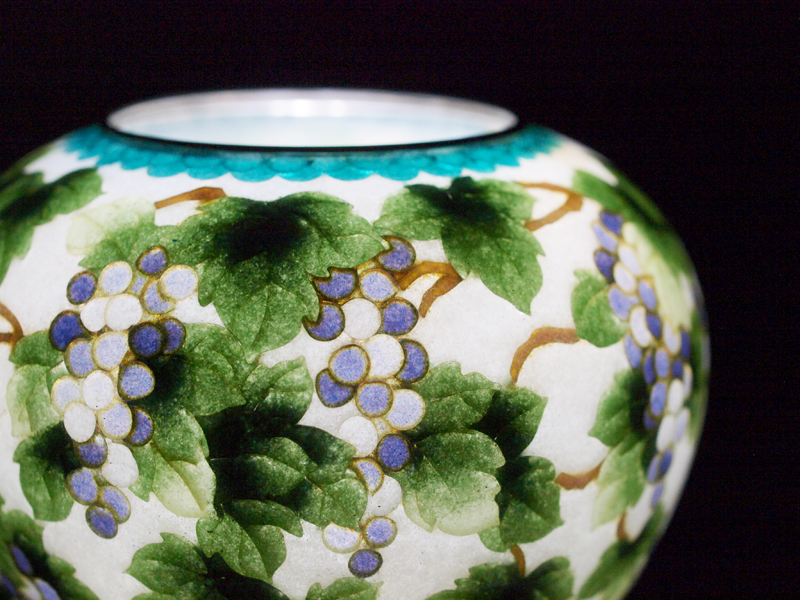 実りの象徴である葡萄の果実と葉を大胆に配し、灯りがともった時、そのままで眺める時、それぞれ全く違う魅力を放つ作品。